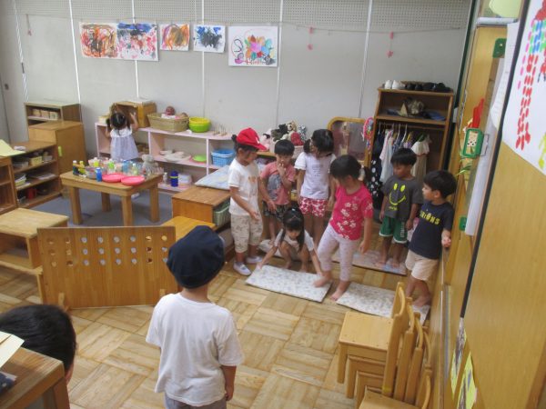 かごや網を使い、赤いかまぼこ板を火に見立ててお肉やお魚、野菜を焼いてみたり、お化け屋敷を作って仲間を驚かせてみたり、