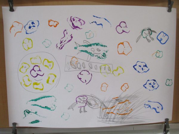 畑でとれたピーマンを使ったスタンプの形をヒントに花火に見立てたり、