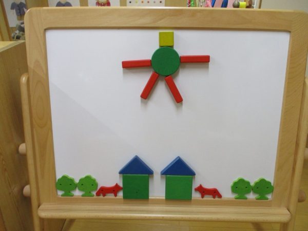 △のマグネットを3つ使ってきつねに〇と長細いマグネットを使って木におうちは…子どもの豊かな想像力でいろいろなきつねのおうちが出来ていました。