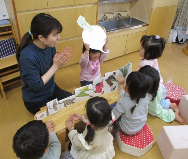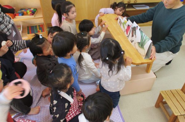 毎月のお誕生会では大人からお話のプレゼントをしています。4月は短いお話から始めて、少しずつ長いお話も楽しんで聞けるようになりました。
