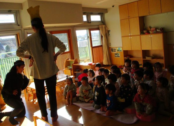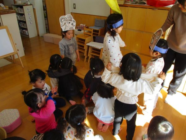 「やぎさん、かわいかったね」「トロル、こわかったよ」と子どもたちの会話が聞かれました。そして、子どもたちもお面をかぶって役になりきります!何回も劇遊びを経験することで声の大きさや迫力が増してきました。