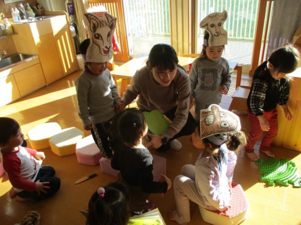 12月、すみれ組のお楽しみ会で大人が『3びきやぎのがらがらどん』の劇をしました。