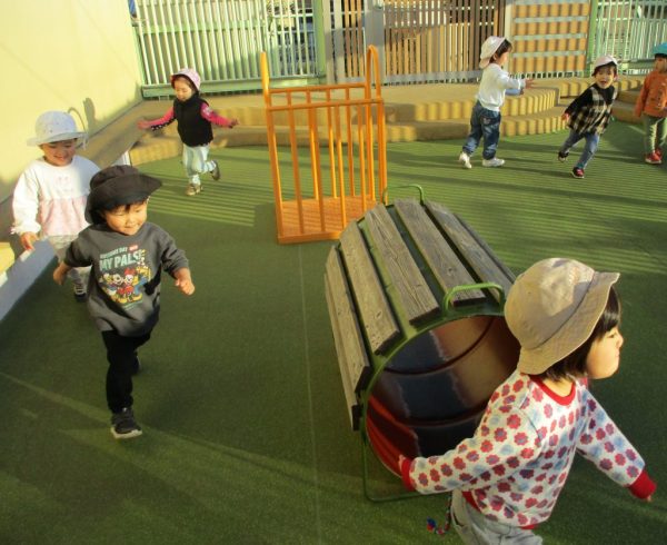 最初の頃はしっぽを取られて泣いていた子も、今ではすっかりルールが分かるようになりました。「しっぽとりしよう!」と子どもきっかけであそび始める事も増えています。