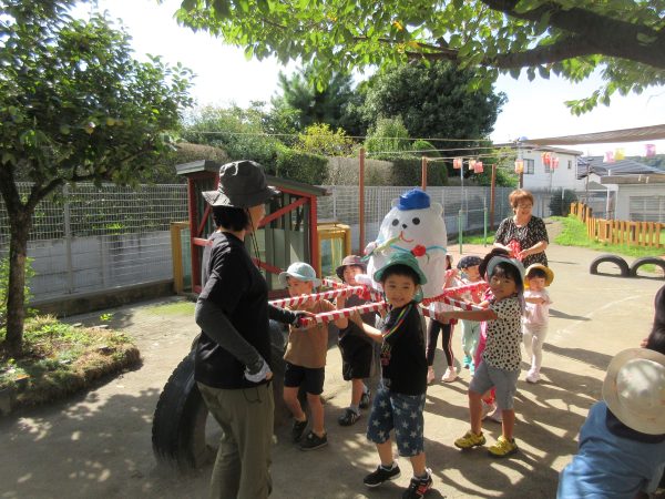 残念ながらこの日は空間の関係上5歳児だけで担いだので翌週天気のいい日に園庭に出てみんなで担ぎました!