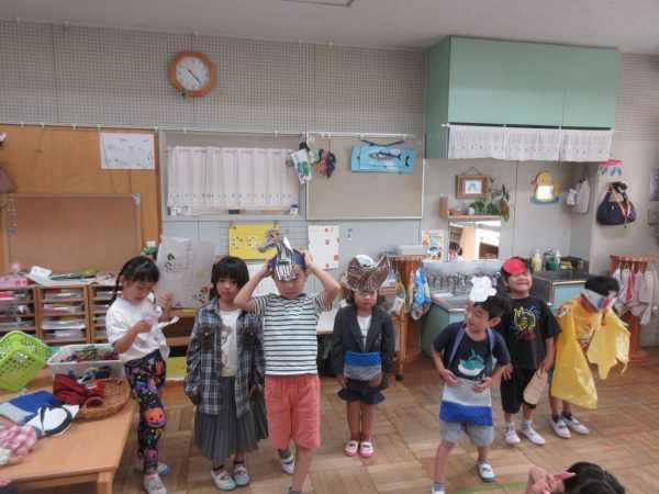翌週に桃太郎や鬼、猿やキジ、犬などお面を作ってみんなの前で演じたクラスもありました。